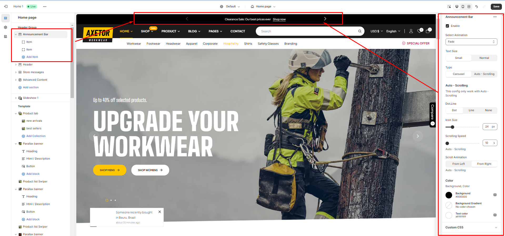 In the theme editor **(Customize) => Section**, click **Announcement Bar**