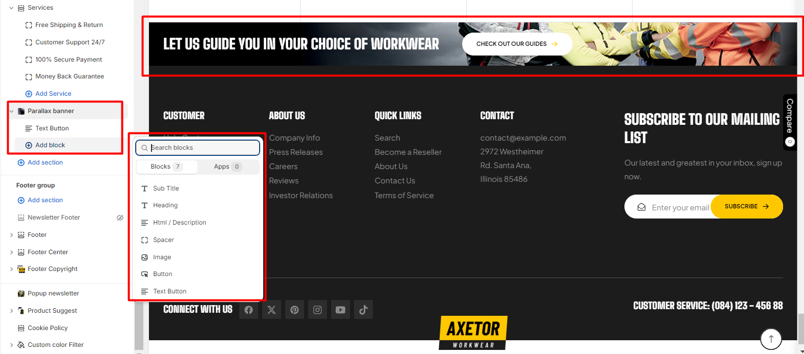 In **Parallax banner** Section **>** Add **Sub Title, Heading, Spacer Description, Image, Button**
