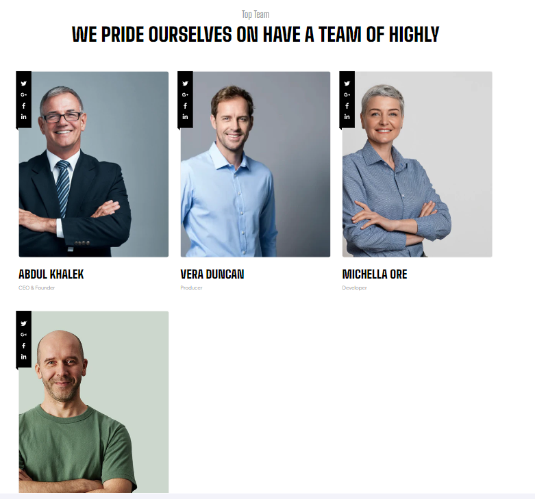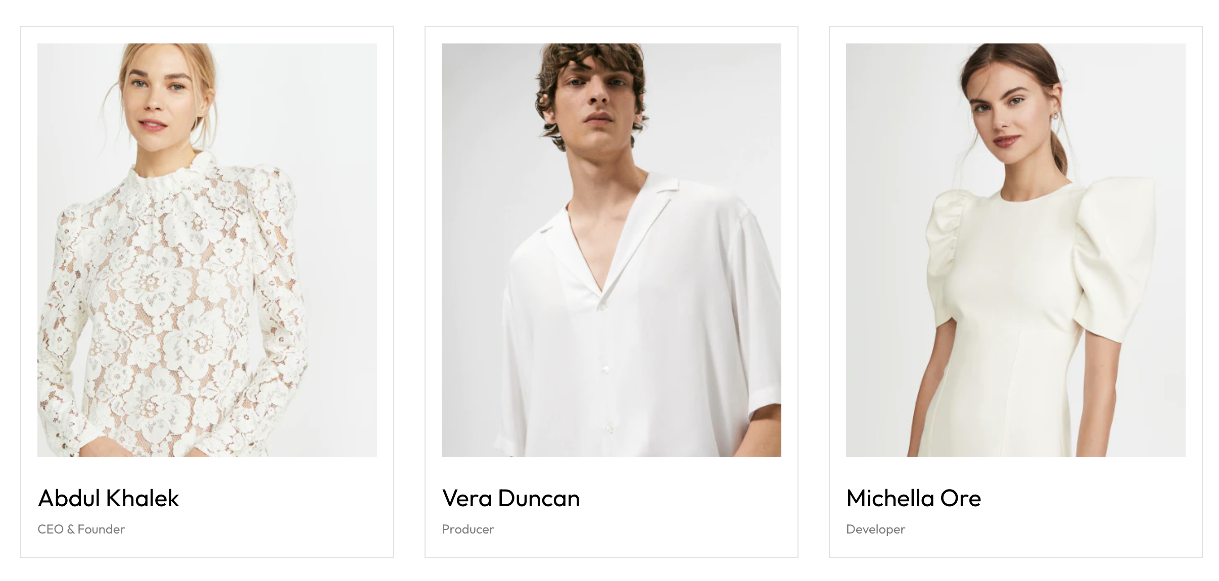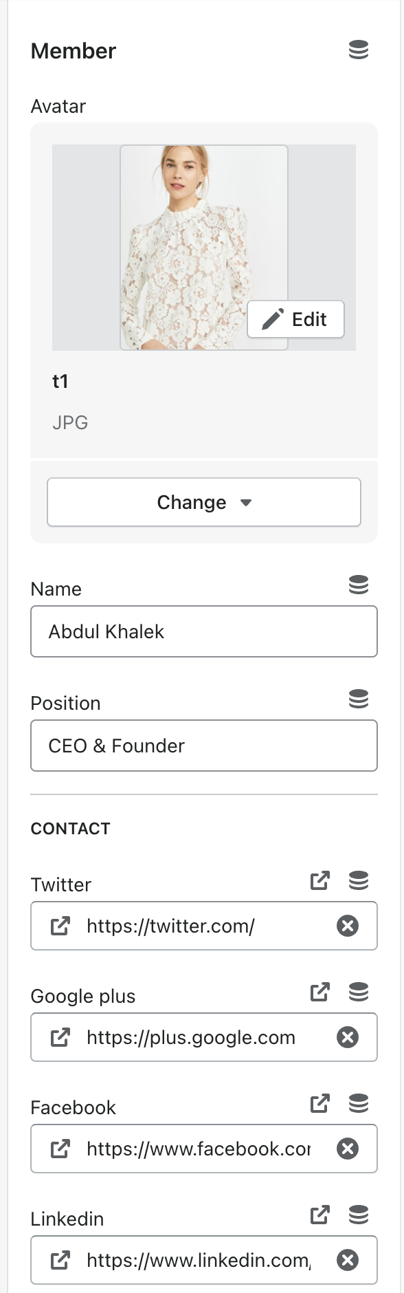 In the theme editor **(Customize) => Section**, Add **Team member**