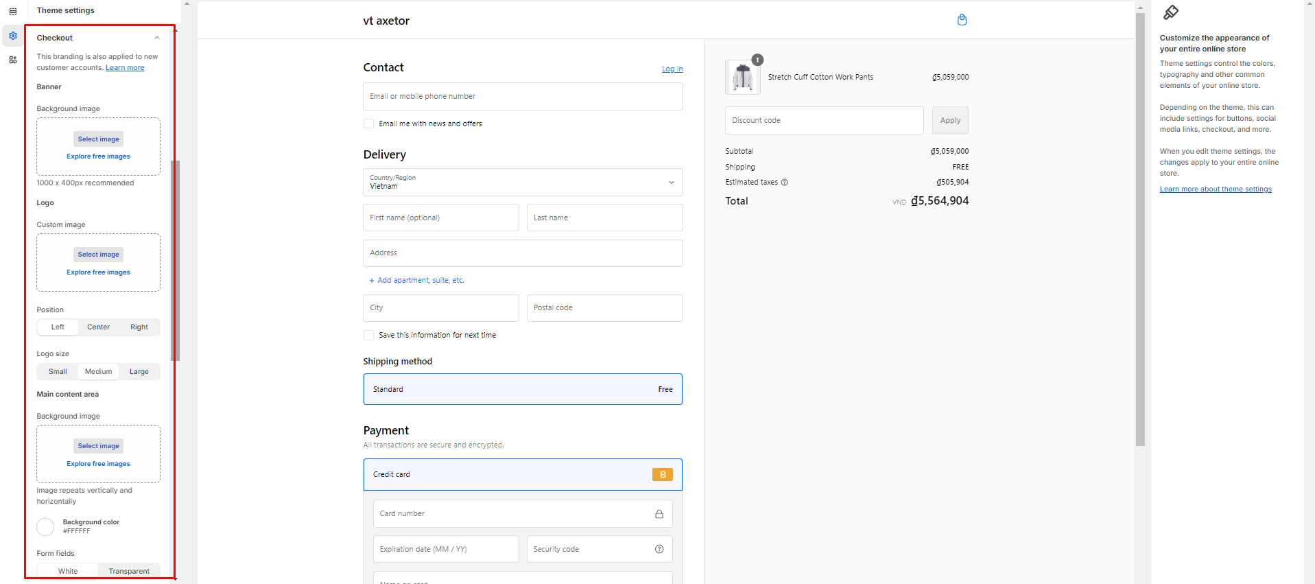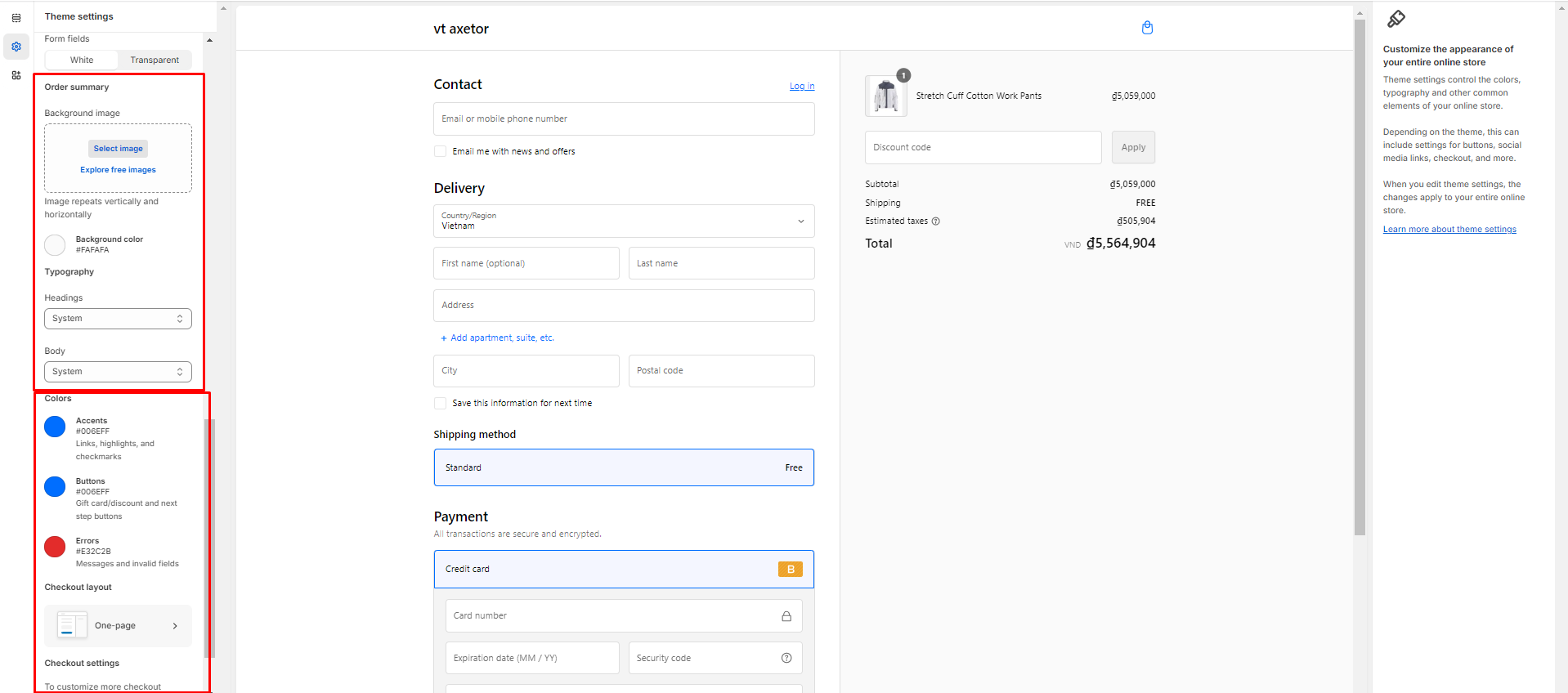 In the theme editor **(Customize) => Theme Settings**, click **Checkout**