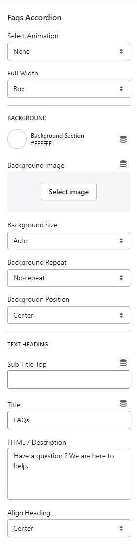 - Background Section, Background Image, Background Size, Background Repeat, Background Position