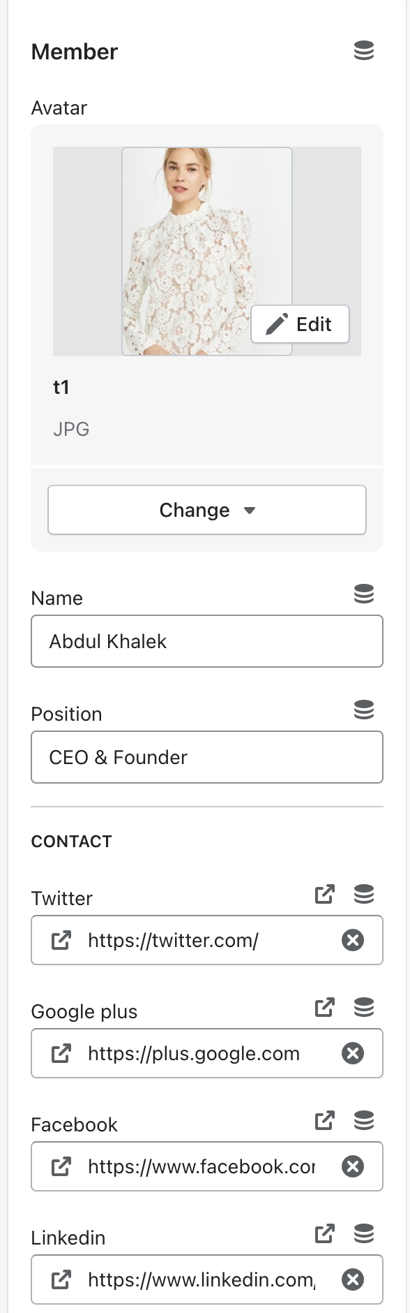 In the theme editor (Customize) => Section, Add Team member