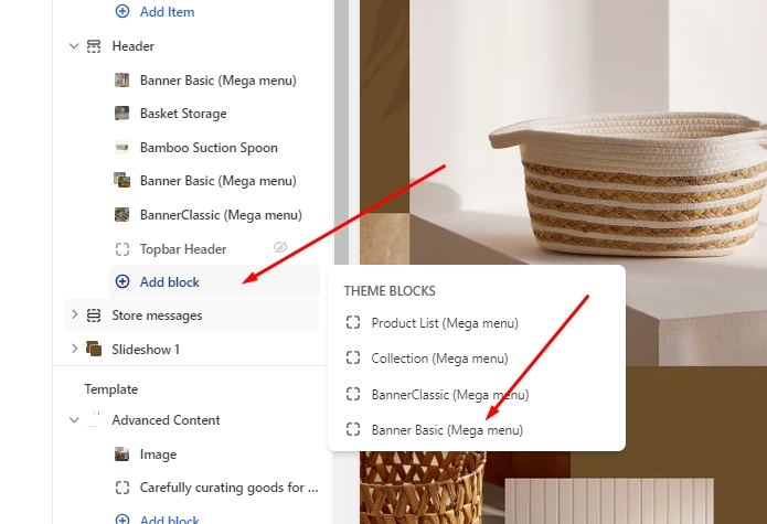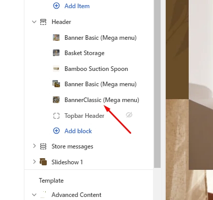 in Customize > click Header > Add Block Banner Basic (Mega menu)