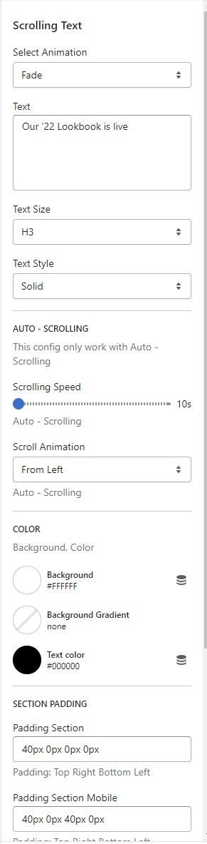 In the theme editor (Customize) => Section, Add Scrolling Text