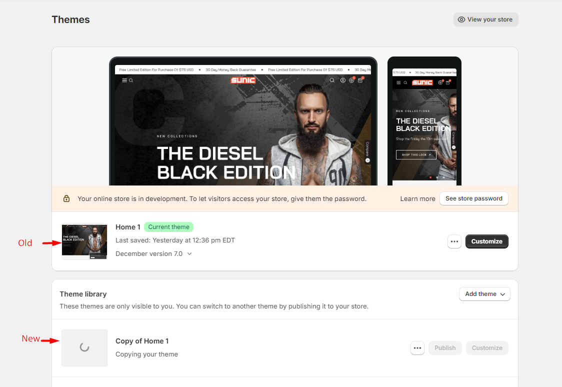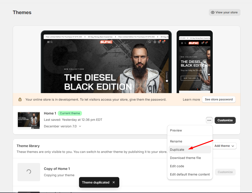 1. Backup your current theme by selecting **Actions > Duplicate** (recommended)