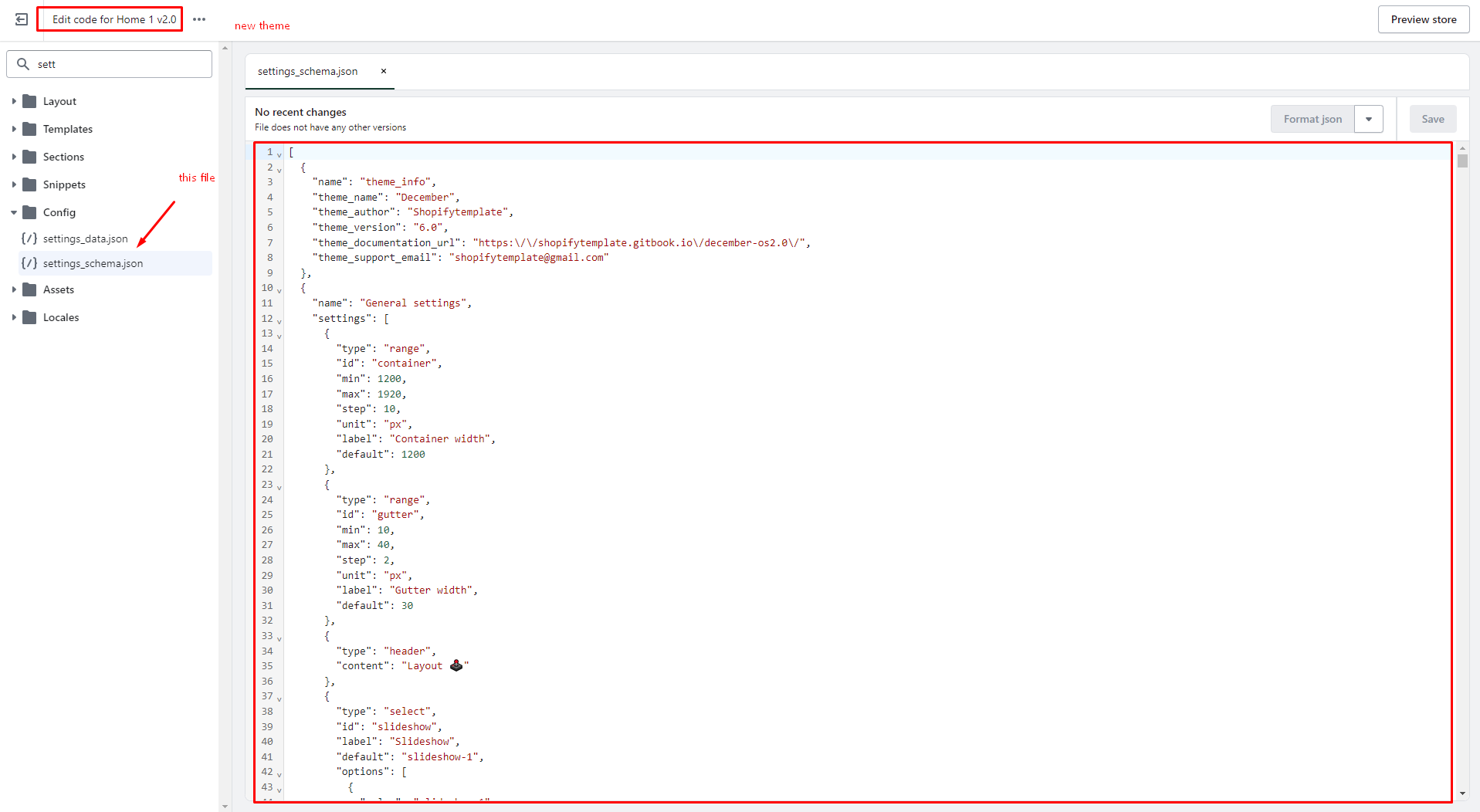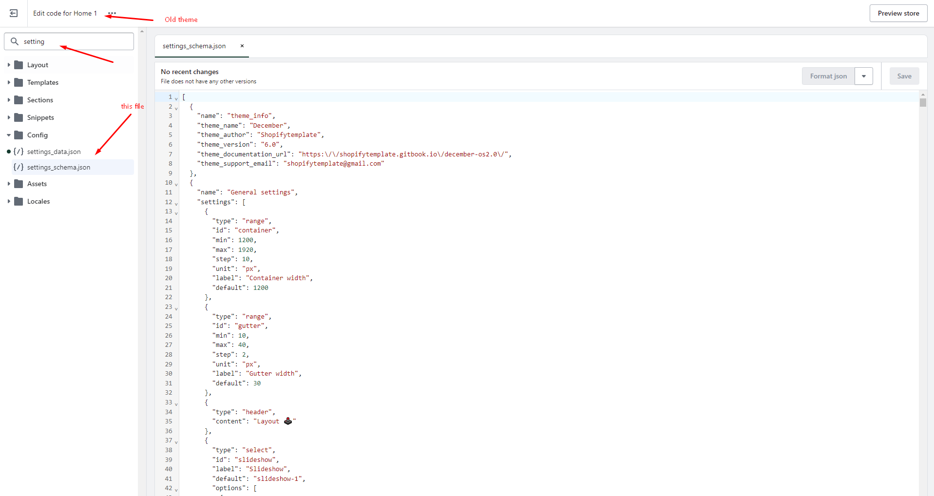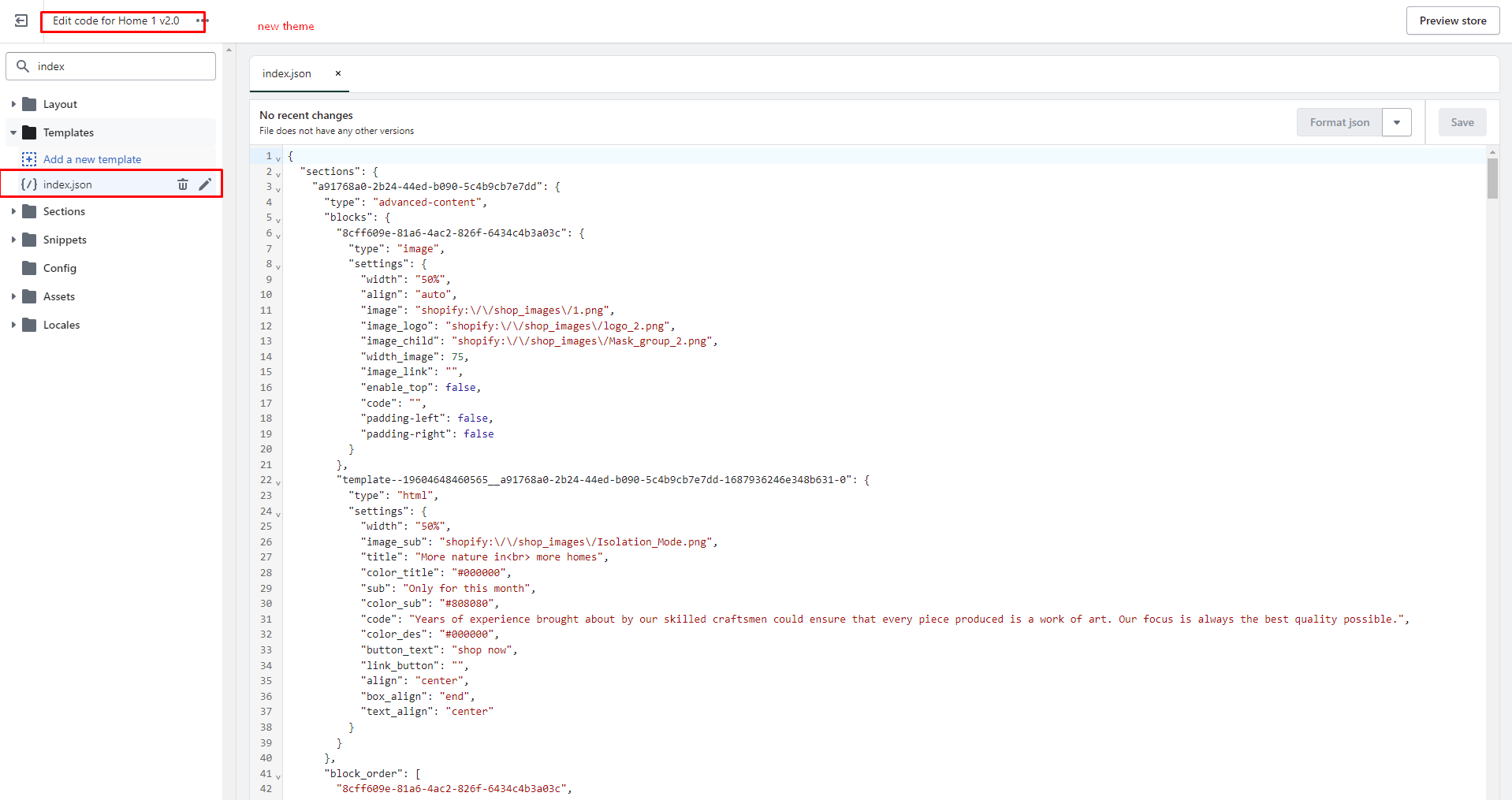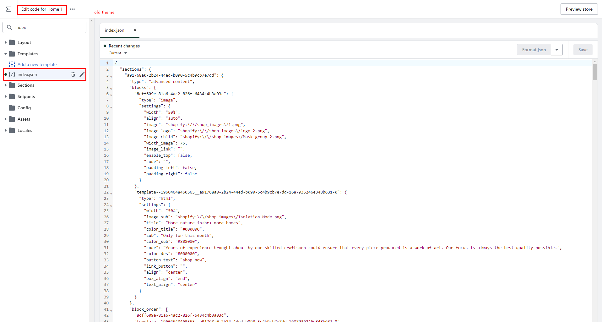 1. Open the old theme. Click **Theme actions -> Edit code -> Open index.json file -> Copy the entire code on this file.** Then paste it into the same file of the new theme.