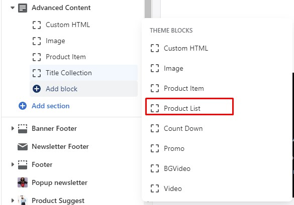 In **Advanced Content** Section => Add **Product List** Block