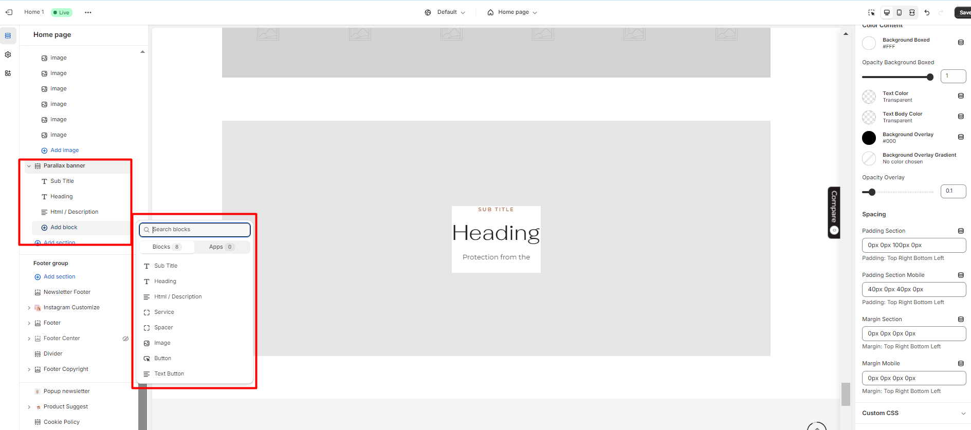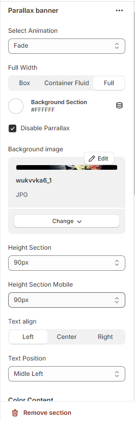 In **Parallax banner** Section **>** Add **Sub Title, Heading, Spacer Description, Image, Button**