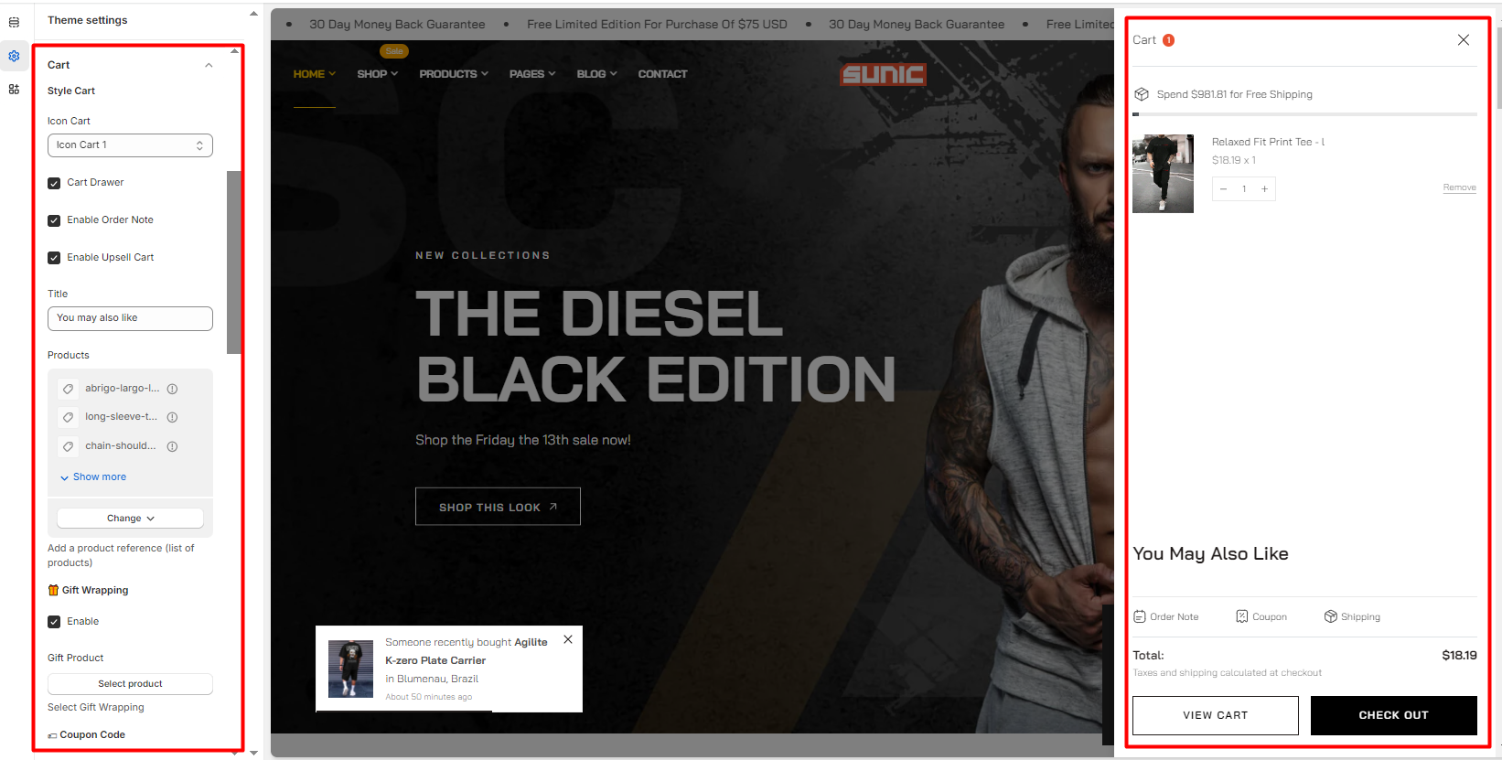 In the theme editor **(Customize) => Theme Settings**, click **Cart**