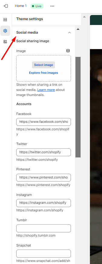 In the theme editor **(Customize) => Theme Settings**, click **Social Media**